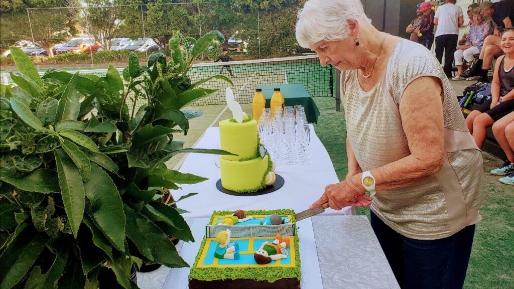 The tennis was followed by cake and bubbly. Enid Dunn, the most senior member of the Waikanae Beach Tennis Club, attended to the formalities (she cut the cake). In fact there were two cakes, one shows how many players felt after their matches, the other the more formal of the pair.