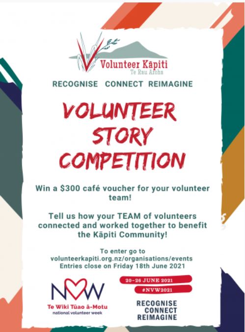 *Stories must be no more than 500 words and photo and story may be shared on Volunteer Kāpiti’s website, social media pages. Winner will be drawn Monday 21st June and will be notified during National Volunteer Week.
