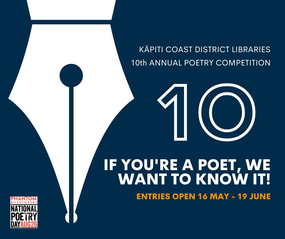 Kāpiti Coast District Libraries annual poetry competition returns for the tenth year. Celebrate Phantom Billstickers National Poetry Day by writing a poem on the theme “Ten”.