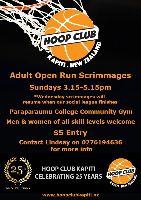 Hoop Club Kāpiti’s Junior Basketball Coaching Programme restarts for Term 3 2022 Sunday 31 July and our HCK Adult Open Run Basketball Scrimmages.