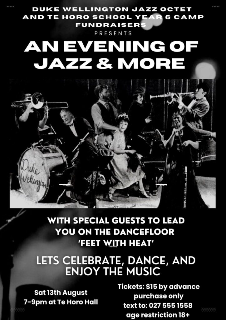 The Te Horo School Fundraising Concert gig looks like being a great night out and alongside the Duke Wellington band will be special guests ‘Feet with Heat’ the swing dance specialists who will lead you on the dance floor.