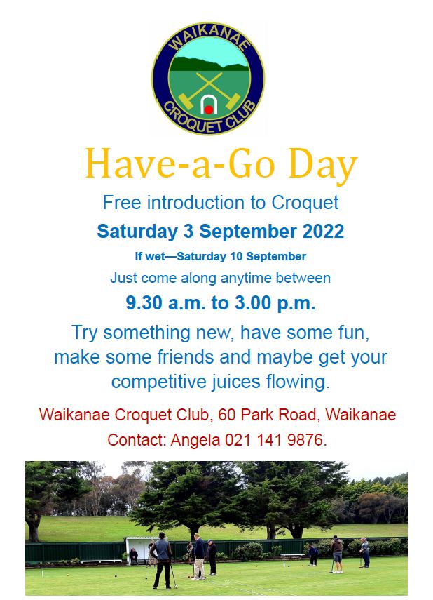 To help promote the club and the sport the Waikanae Croquet club are holding a Have-a-Go Day on Saturday September 10 (see poster below for details – DATE CONFIRMED is SEPTEMBER 10