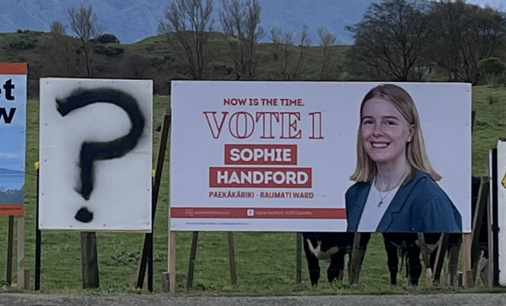 With campaiging now well under way, we need to ask if the residents of the Paekākāriki-Raumti Ward have had some urban masterpieces secretly left in their rohe?  Along with the regular groomed headshots of candidates and views of Kāpiti Island from every angle are a series of hand painted original signs showing large black question marks.