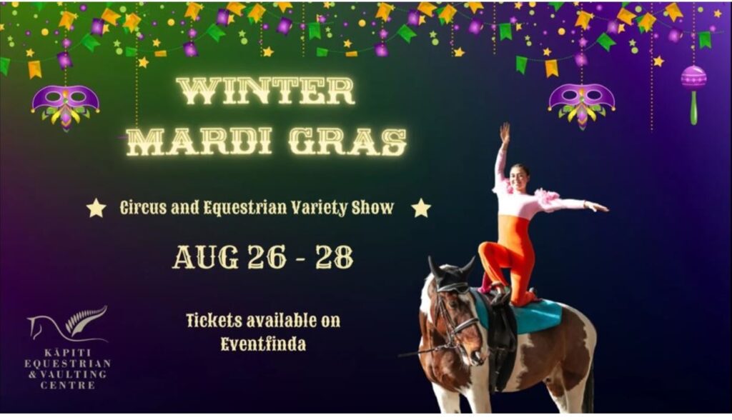 Everyone will be wrapped in colour in the theme of a Mardi Gras celebration. We will have our horses jumping and people jumping on, off and over them in amazing ways. Acrobats on the ground and up in the air, there will be something to leave you a little in fear!! But fear not, we are all professionals here and can’t wait to share all the magic that’s taken years to perfect, come on down to the Kāpiti Equestrian Centre where we will hold all these fantastic performers!!
