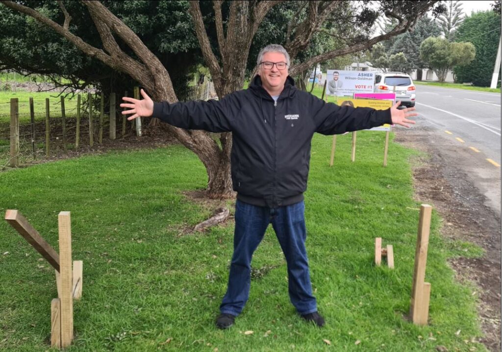 Kapiti Mayoral candidate Rob McCann stands in for missing sign
