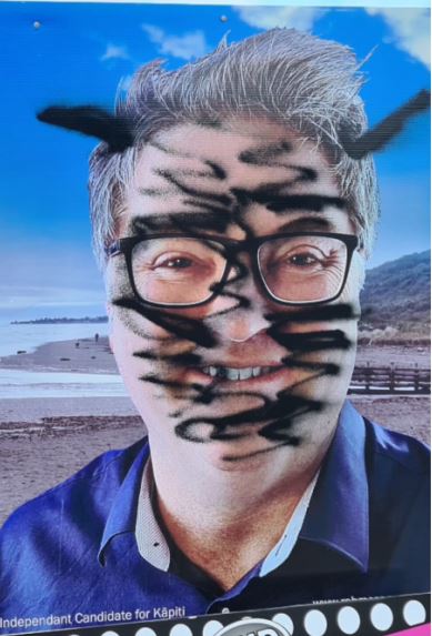 Cr McCann’s billboards had been the target of vandals with an initial wave of spray painting that Mr McCann thought was inspired by the monster in Stranger Things (see image below). However, a new wave of vandalism has seen two large 2.4 metre billboards completely removed from the Ōtaki and Waikanae townships after being sawn off close to the ground.