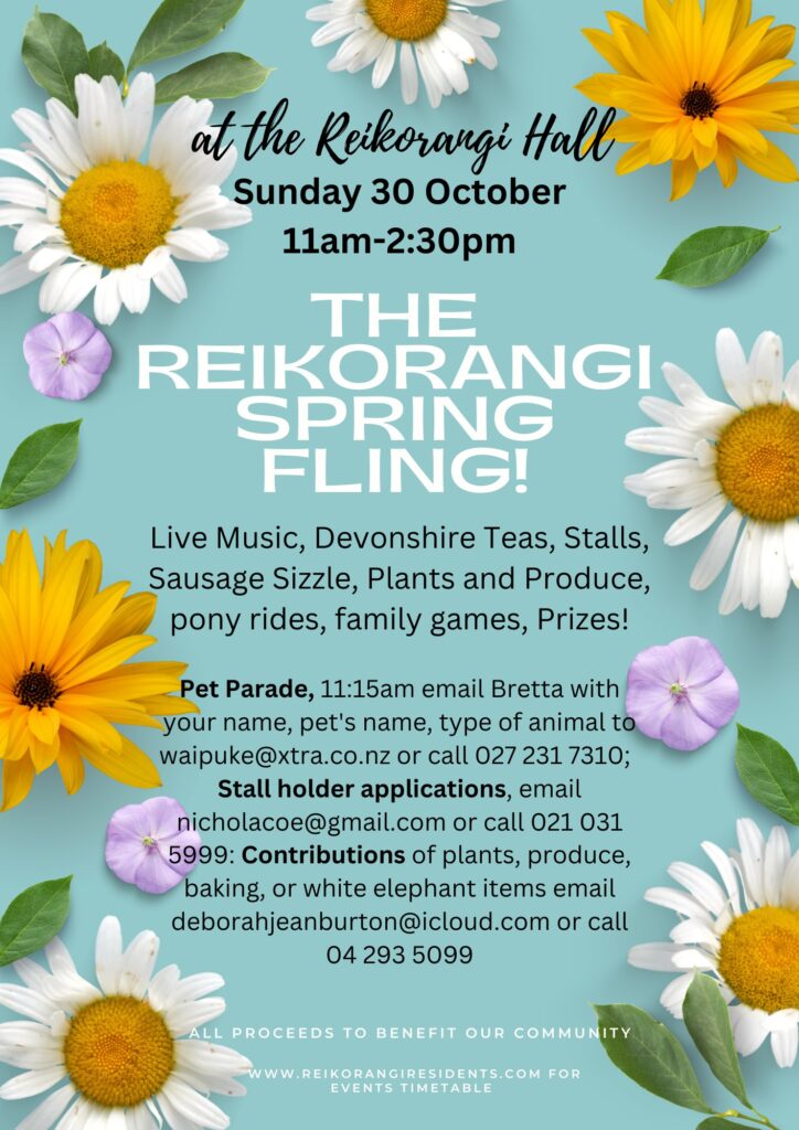 For more info on the Reikorangi Spring Fling and other happenings in Reikorangi see www.reikorangiresidents.com