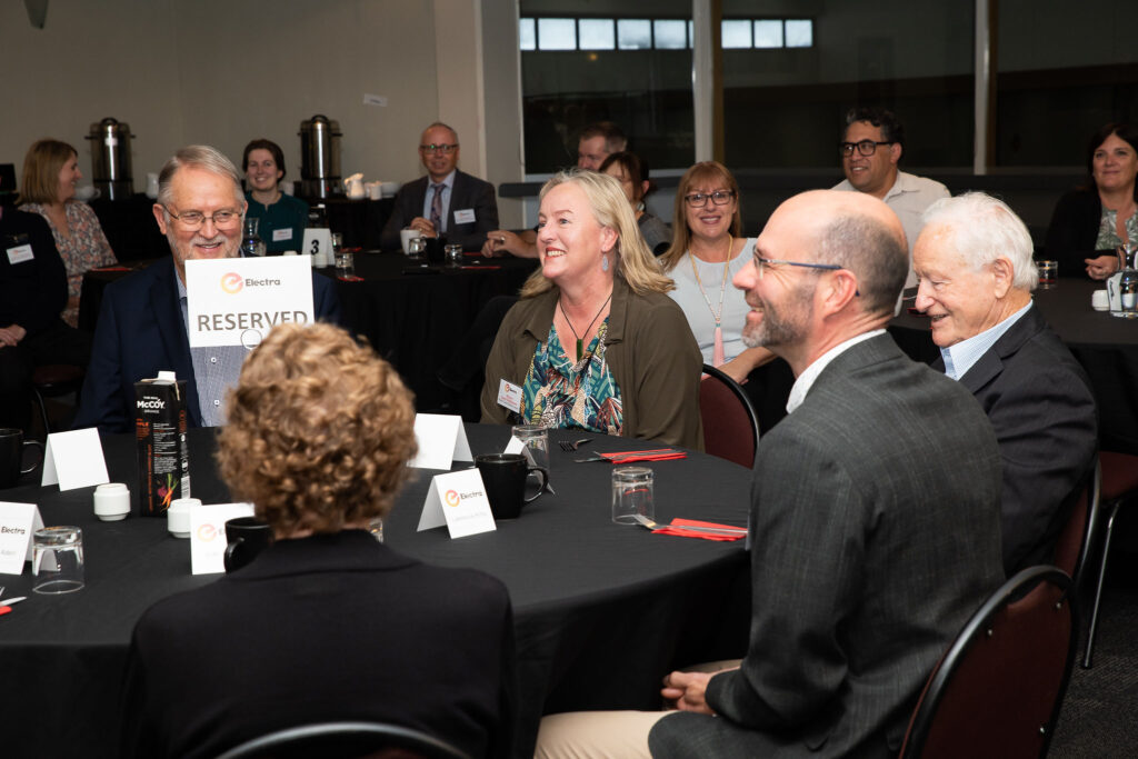 Mike Underhill (Electra). Mayor Janet Holborow, former PM Jim Bolger, and deputy mayor Lawrence Kirby at the Kapiti Electra Business Breakfast. Photo by Bianca-Rae Photography