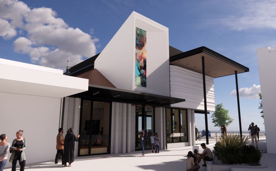 Another significant step in the build was the recent installation of four fibreglass-reinforced concrete panels. The panels, ranging in weight from 1.2 to 1.5 tonnes, are made of a fibreglass/concrete compound, which is lighter than precast concrete and enables shapes and textured designs to be formed. The wave features on the panels, inspired by the Reikorangi Potteries, represent the finger traces of a potter as they create a piece of art.