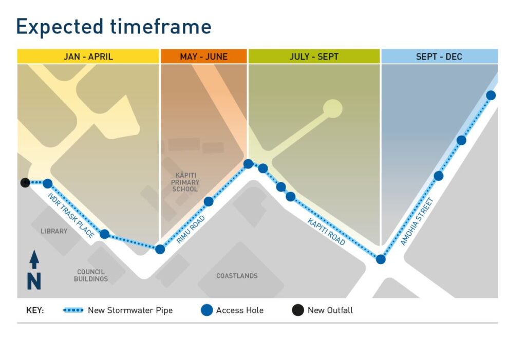 “The first job is to build a new outfall into the Wharemaukū Stream on Iver Trask Place. Over the next 10 months, the stormwater pipe will be installed in a trench along Iver Trask Place towards Rimu Road, then along Rimu Road to Kāpiti Road, across the intersection, west to Amohia Street and then north along Amohia Street,” said Mr Mallon.
