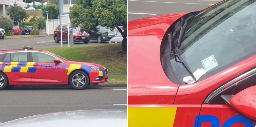 This photo from Dion Taylor-Gray shows a Police car being ticketed by the Porirua City Council parking enforcement team. It seems the police car was parked from 930 to 215 in a 2 hour car park. OOPS.
