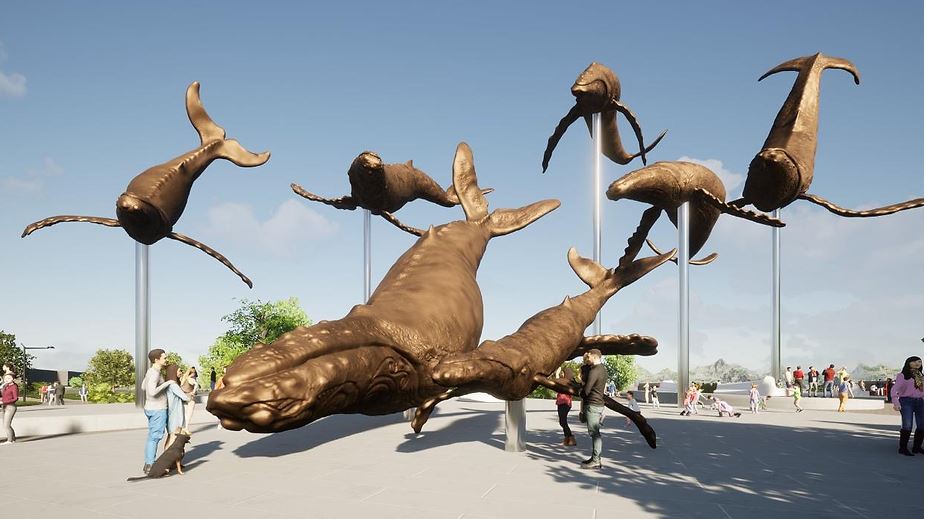 Whale Song (See stunning video below) is the centrepiece of the Wharemauku Park regeneration project which would feature seven bronze-coated humpback whales.