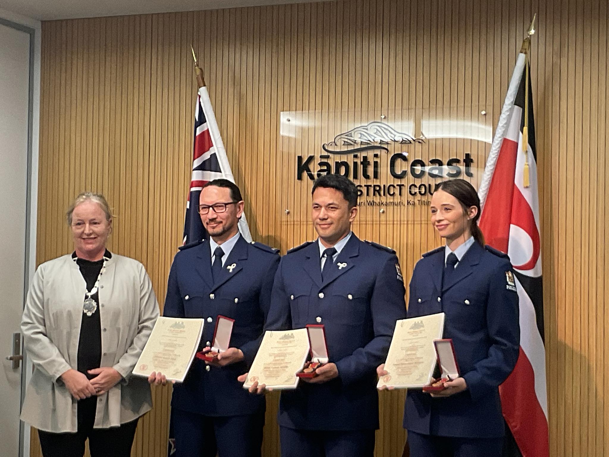 Three Kāpiti-Mana constables were presented bravery awards by Kāpiti Mayor Janet Holborow at the Kāpiti Council today.