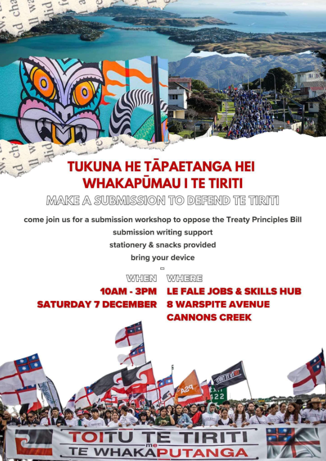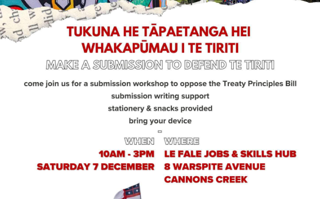 Following on from the energy that Porirua gave to the Hikoi when it arrived in our city, we are now running a Submissions workshop this Saturday the 7th of December at Le Fale in Cannons Creek.