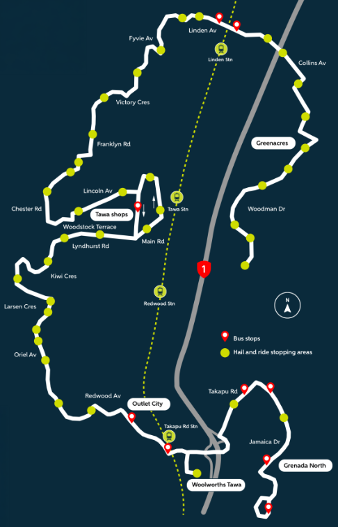 The service will operate weekdays from 7am to 7pm, running between Greenacres and Grenada North, with stops at Tawa shops, Takapu Road Station, and Linden Station.