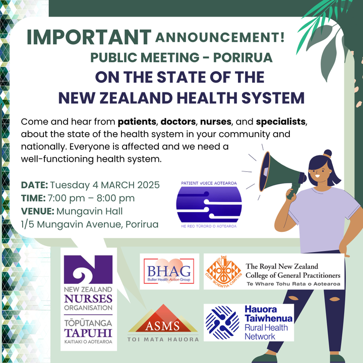 Hosted by Patient Voice Aotearoa, the event is supported by key organisations, including the New Zealand Nurses Organisation, the Royal New Zealand College of General Practitioners, ASMS Toi Mata Hauora, Hauora Taiwhenua Rural Health Network, and the Butler Health Action Group.