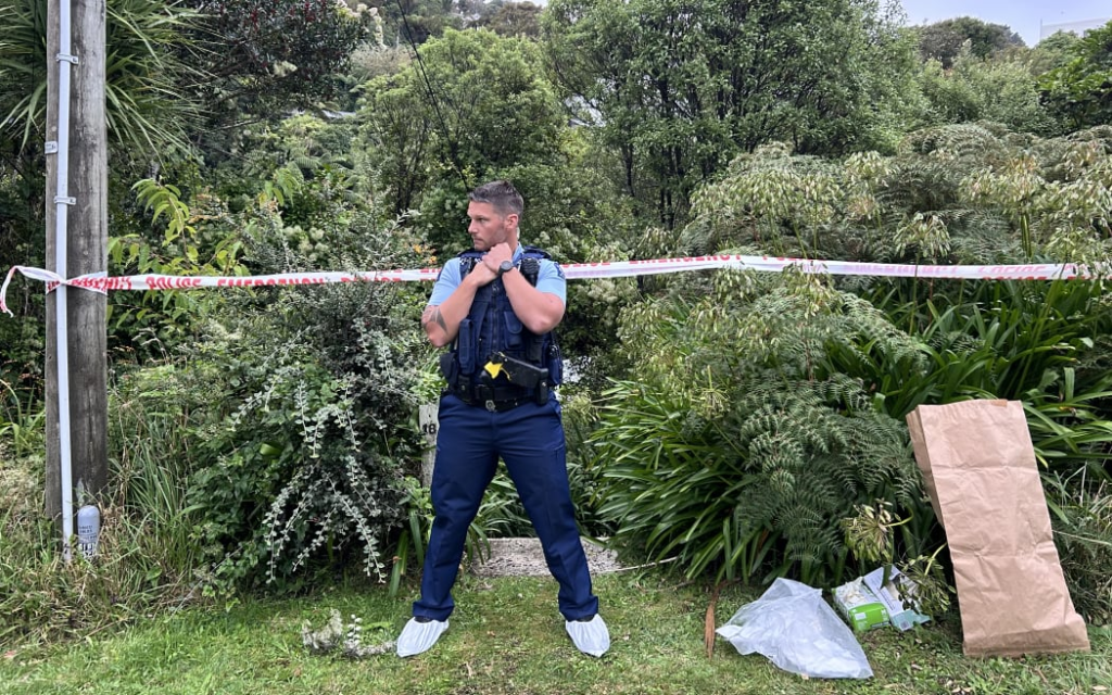 (Wellington police at the scene in Albemarle Road, Northland, where a man was found dead outside a property. Photo: RNZ / Ashleigh McCaull)