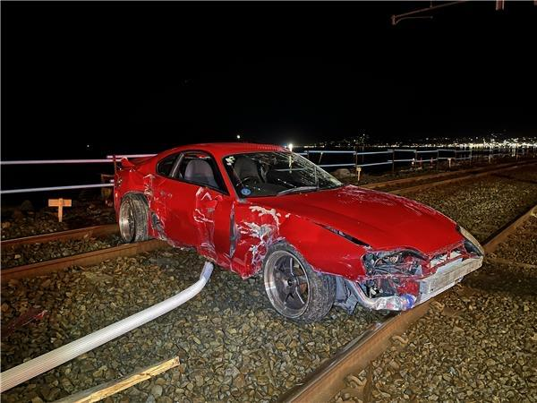One vehicle involved in the night’s events lost control on State Highway 2, crashing through a metal barrier and landing on railway tracks. Remarkably, the two occupants escaped without serious injury.