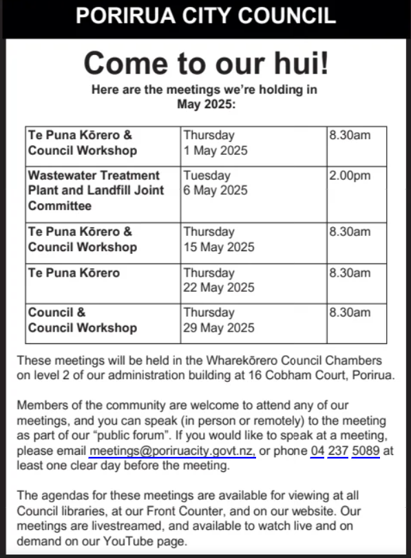Porirua City Council Meeting Notices – for May 2025 April 22, 2025 Tim Wilson Latest news..., Public Notices 0