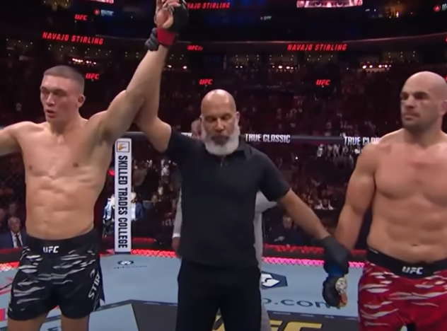 Earlier in the fight, Stirling mixed in leg kicks and clinch work but absorbed some stiff jabs from the more experienced Erslan. He showcased solid grappling awareness, reversing multiple cage positions to avoid danger.