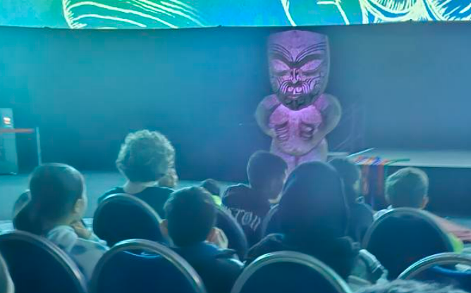 Adding to the month’s celebrations, the school travelled to Te Rauparaha Arena to experience an immersive Matariki presentation hosted by Porirua City Council in partnership with Ngāti Toa Rangatira. Students were captivated by glow-in-the-dark poi, a beautifully carved waharoa, and wide-screen visuals that even featured the students themselves.