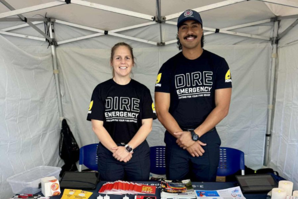 Firefighters wearing NZPFU “Dire Emergency” t-shirts staffing a community safety stall as part of ongoing public education work during lawful industrial action.