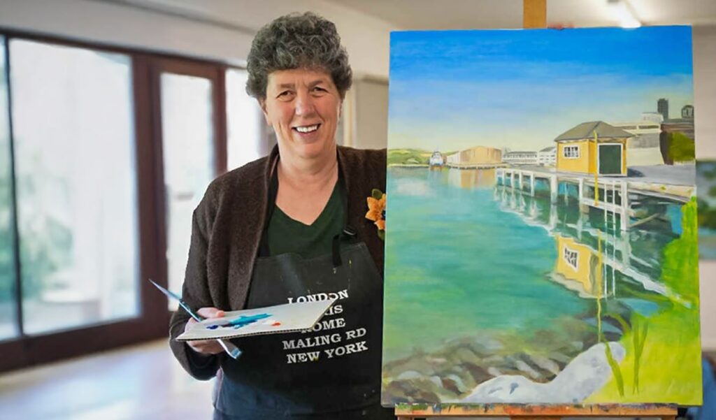 Jeanette Hawinkels with her work from The Mana Arts Society exhibiting at Pataka