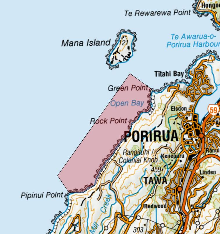 Rāhui area – from Pipinui Point (Boom Rock) to Kōmanga Rau Tawhiti (Green Point) and extending approximately 1 nautical mile out to sea.